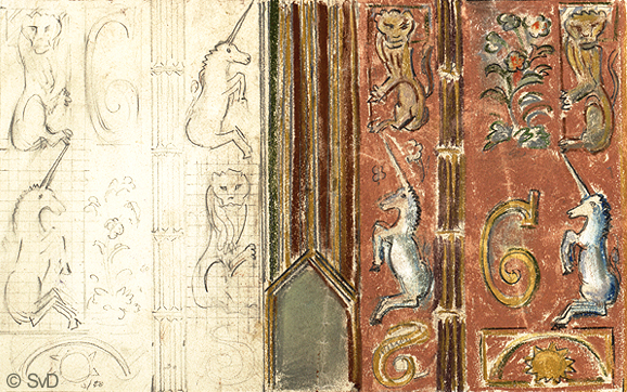 Ontwerp voor de paleiskamer; detail met fabeldieren, die mogelijk zijn geïnspireerd op de Franse wandtapijten van De dame met de eenhoorn.