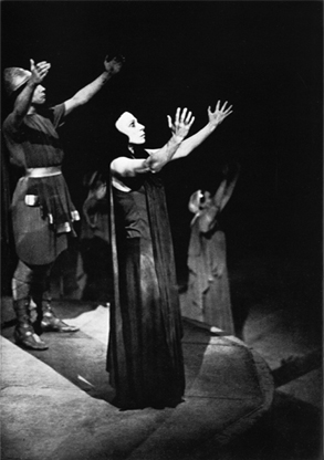 Van Dalsum als Aigisthos bij het lijk van Klytaimestra te midden van het koor (de reien), in het door hemzelf ontworpen decor. "... met zijn Bacchuskop, zijn wreedaardig grijnzende mond zo ongeveer de klassieke boeman uit de kindersprookjes. Een geweldenaar, in wie al wat slecht is culmineert, en voor wie men huiverend terugdeinst" 5